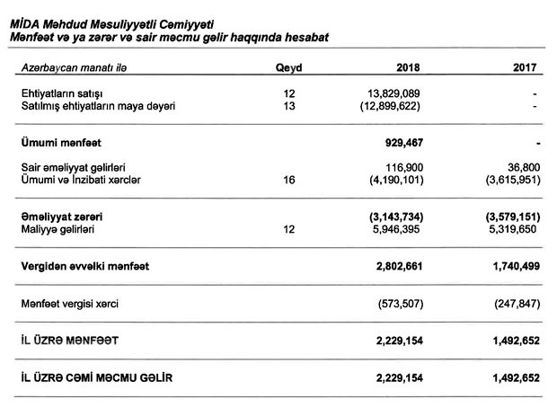 "Marja" "MİDA" MMC-nin 2018-ci il üzrə illik maliyyə hesabatlarına istinadən xəbər verir ki, MMC 2018-ci ili 2 milyon 229 min manat xalis mənfəətlə başa vurub. Bu, 2017-ci illə müqayisədə 49,3% çoxdur. Ötən il "MİDA" MMC 13 milyon 829 min manat ehtiyatların satışından gəlir və 117 min manat sair əməliyyat gəlirləri əldə edib. 12 milyon 900 min manat satılmış ehtiyatların maya dəyəri və 4 milyon 490 min manat ümumi və inzibati xərclər bu gəlirləri tamamilə silib və 3 milyon 144 min manat əməliyyat zərəri yaranıb. Digər tərəfdən 5 milyon 946 min manat maliyyə gəlirləri hesabına zərər bağlanıb və MMC-nin mənfəət vergisindən sonra 2 milyon 229 min manat xalis mənfəəti qalıb.