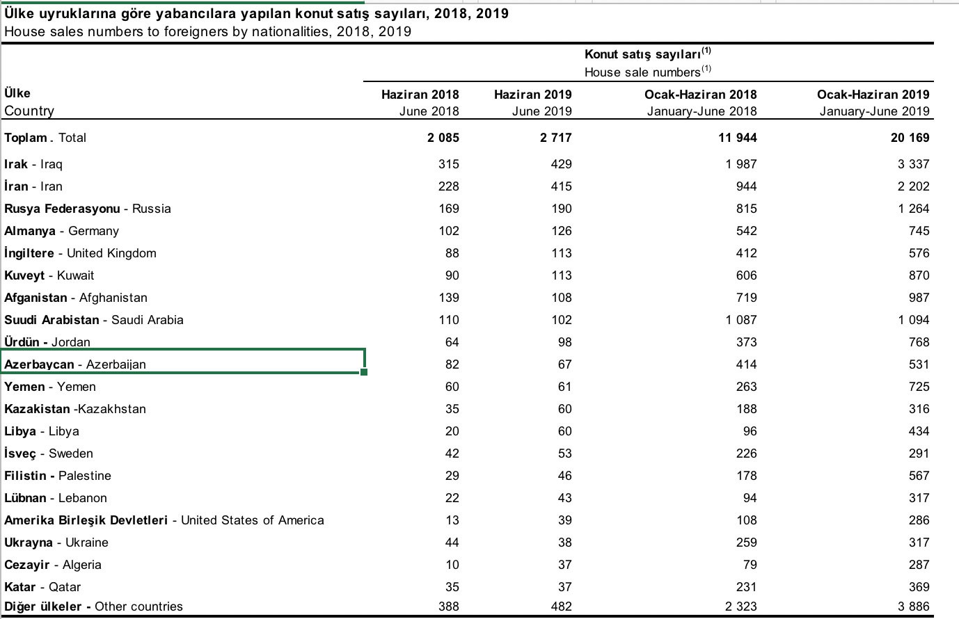 Azərbaycanlılar Türkiyədə mənzil alan xaricilər arasında 10-cu yerdədir. İyun ayında Türkiyədən ən çox mənzili İraq vətəndaşları alıblar - 429 mənzil. İraqlıların ardınca 415 mənzil ilə İran, 190 mənzil ilə Rusiya vətəndaşları gəlirlər.