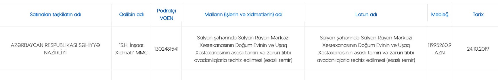 "Marja" xəbər verir ki, müqavilə Salyan şəhərində Salyan Rayon Mərkəzi Xəstəxanasının Doğum Evinin və Uşaq Xəstəxanasının əsaslı təmiri və zəruri tibbi avadanlıqlarla təchiz edilməsini nəzərdə tutur.