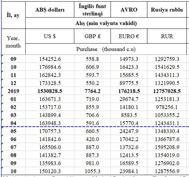 Ötən ilin 10 ayı ərzində ABŞ Dolları üzrə 1 milyard 701 milyon 21 min valyuta vahidi məbləğində alış, 2 milyard 605 milyon 522 min valyuta vahidi məbləğində satış əməliyyatı aparılmışdı. Beləliklə, bankların əhaliyə dollar satışı təxminən 515 milyon 255 min valyuta vahidi və ya 19,7% azalıb. Əhalinin banklara satdığı ABŞ dollarının həcmi isə 169 milyon 193 min valyuta vahidi və ya 9,9% azalıb.