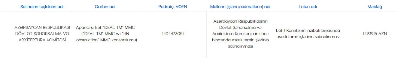 "Marja" xəbər verir ki, "İdeal TM"/"HN Construction" konsorsiumu Dövlət Şəhərsalma və Arxitektura Komitəsi tərəfindən komitənin binasında əsaslı təmir işlərinin satın alınması üzrə elan edilmiş tenderin qalibi olub.