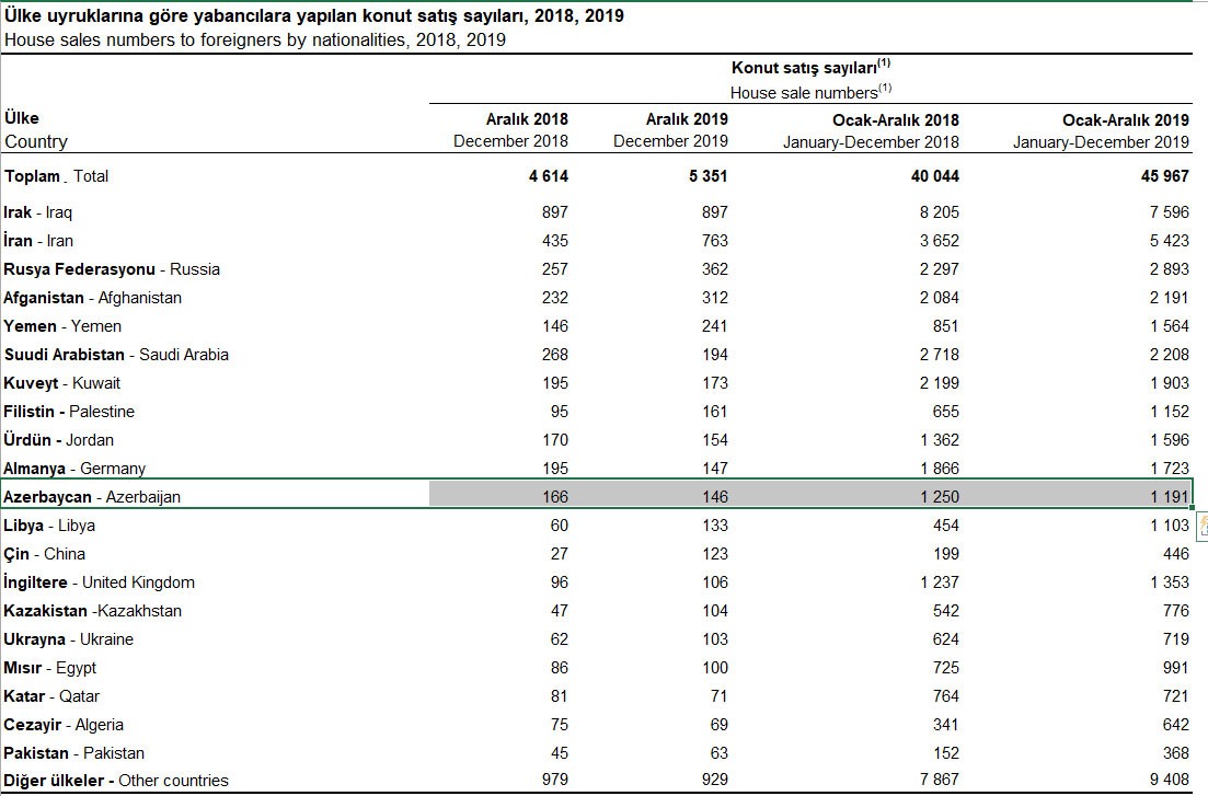 2019-cu ilin Yanvar-Dekabr dövründə (12 ayda) isə azərbaycanlılar Türkiyədə 1191 mənzil alıblar. 2018-ci ildə bu say 1250 idi.
