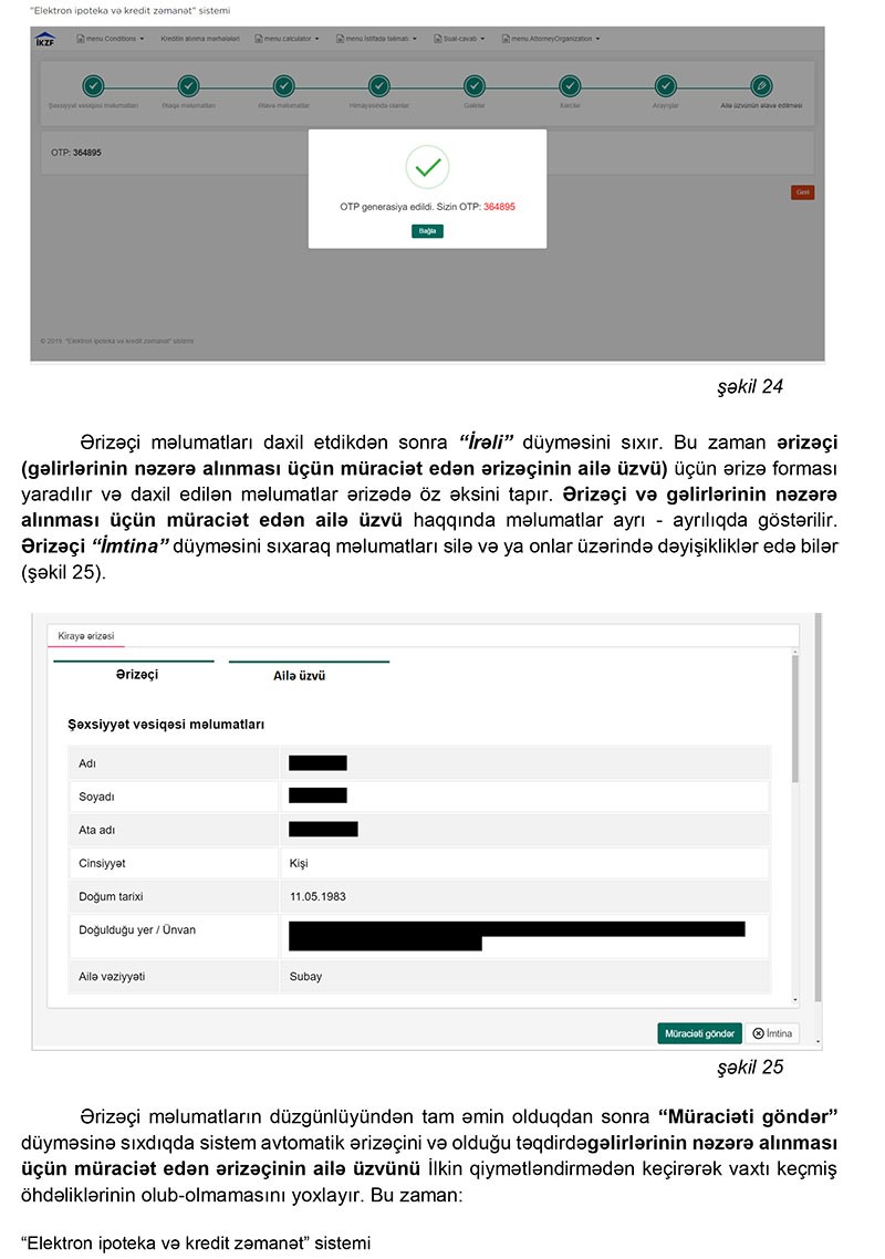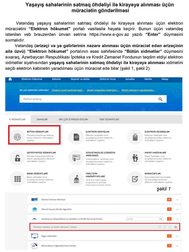“Marja” xəbər verir ki, “Elektron ipoteka və kredit zəmanət” sistemi vasitəsilə yaşayış sahələrinin satmaq öhdəliyi ilə kirayəyə alınması üçün müraciətə dair istifadəçi təlimatı dərc edilib.