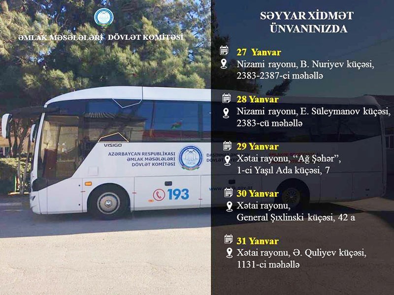 Xətai rayonu üzrə mənzillərin mobil qeydiyyatı 29 yanvarda “Ağ Şəhər”, 1-ci Yaşıl Ada küçəsi, 7, yanvarın 30-da General Şıxlinski küçəsi, 42a, 31 yanvarda isə Ə.Quliyev küçəsi, 1131-ci məhəllə ünvanlarında aparılacaq.