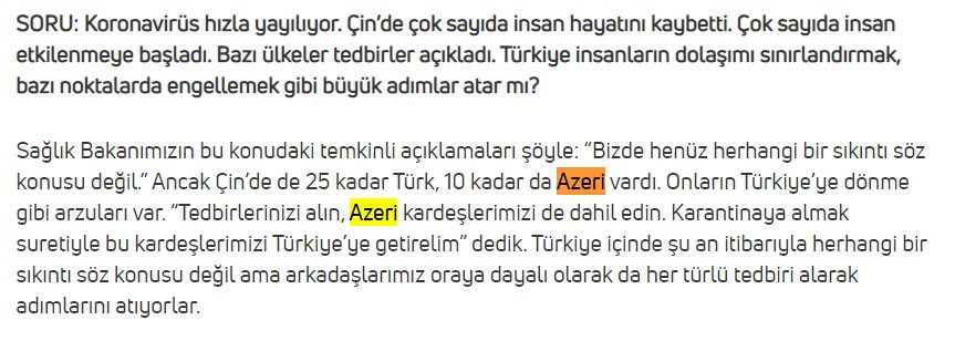 "Çində 25-ə qədər Türk, 10-a qədər də Azəri vardı. Onların Türkiyəyə gəlmək kimi arzuları var. Karantinə alaraq surətilə bu qardaşlarımızı də Türkiyəyə gətirək".