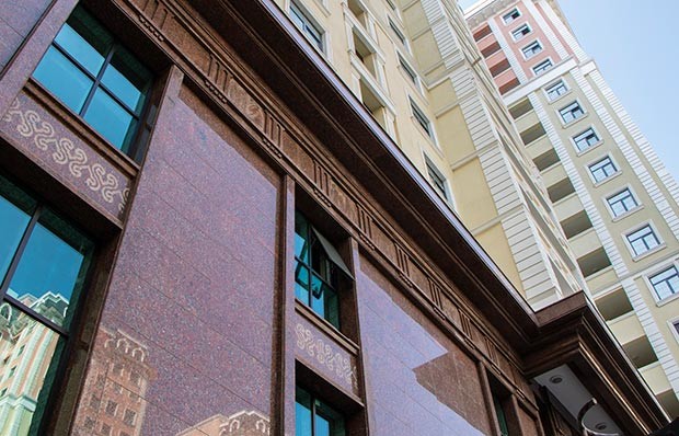 Binalar Naxçıvan istehsalı aqlay və Ukrayna istehsalı qranitlə üzlənərək xüsusi dizaynı ilə təmtəraq nümunəsi təsiri bağışlayır.