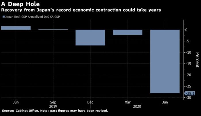 Yaponiya iqtisadiyyatı ilin ikinci üç aylıq dövründə kəskin azalıb. Səbəb koronavirus ilə əlaqədar olaraq sərmayələrin və istehlakçı xərcləmələrinin azalmasıdır.