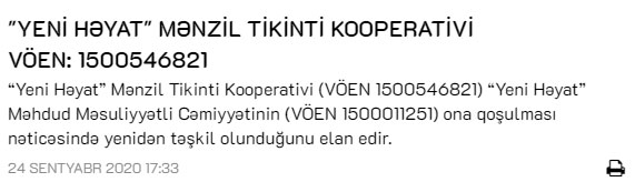 Marja xəbər verir ki, buna səbəb “Yeni Həyat” MMC-nin “Yeni Həyat” Mənzil Tikinti Kooperativinə qoşulmasıdır.