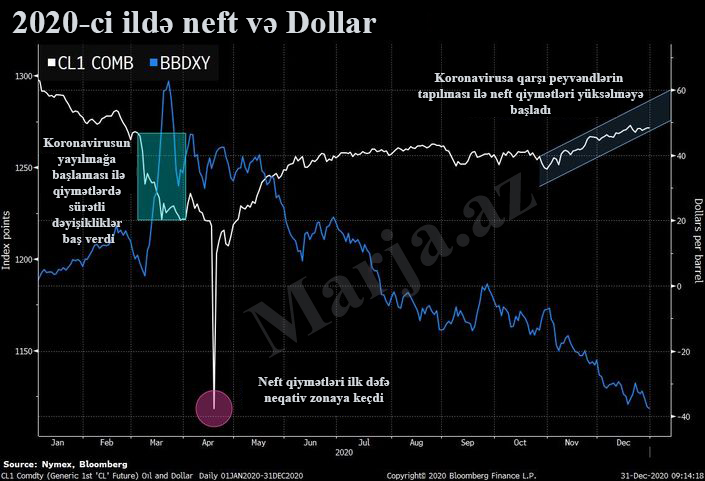 Neft qiymətləri 2020-ci ildə təxminən 20% düşmüşdür. Koronavirusun sürətli bir şəkildə dünyaya yayılmağa başlaması ilə bazarlar Mart və Aprel aylarında böyük bir çöküş yaşamışdır.