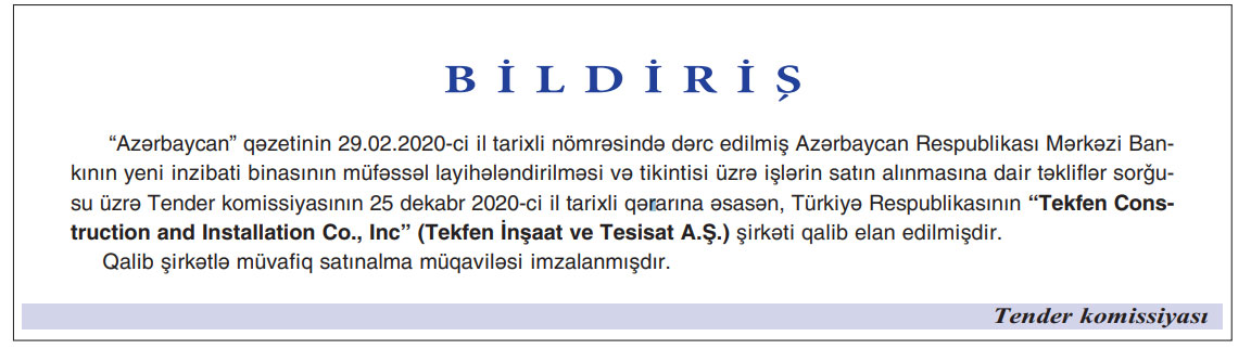 Türkiyənin "Tekfen Holding" şirkəti, törəmə şirkəti "Tekfen İnşaat"ın Azərbaycan Mərkəzi Bankı üçün yeni inzibati binanın tikintisi tenderinin qalibi olduğunu açıqlayıb.