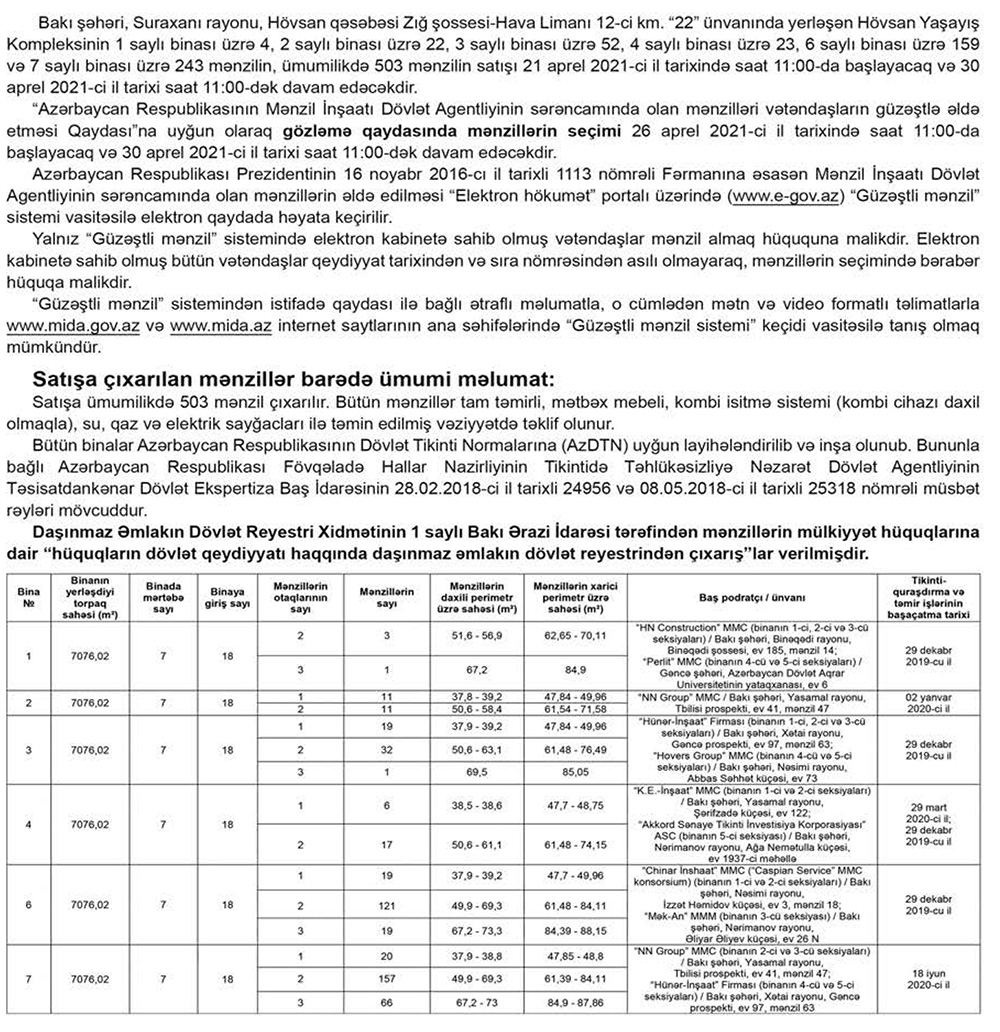 Marja xəbər verir ki, Bakı şəhəri, Suraxanı rayonu, Hövsan qəsəbəsi Zığ şossesi-Hava Limanı 12-ci km. “22” ünvanında yerləşən Hövsan Yaşayış Kompleksinin 1 saylı binası üzrə 4, 2 saylı binası üzrə 22, 3 saylı binası üzrə 52, 4 saylı binası üzrə 23, 6 saylı binası üzrə 159 və 7 saylı binası üzrə 243 mənzilin, ümumilikdə 503 mənzilin satışı 21 aprel 2021-ci il tarixində saat 11:00-da başlayacaq və 30 aprel 2021-ci il tarixi saat 11:00-dək davam edəcəkdir.