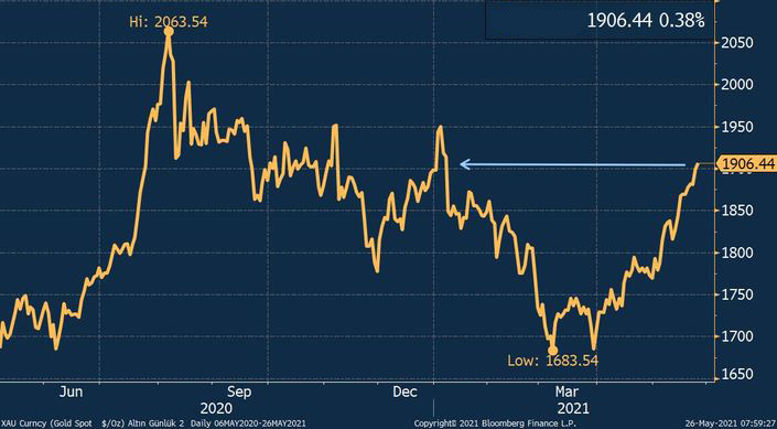 2021-ci ilin ilk üç ayında ucuzlaşdıqdan sonra, qızılın unsiyasının qiyməti bu gün 1900 dolları keçib. Sonuncu dəfə Yanvar ayının əvvəlində bu səviyyələrdə olan qızılın qiyməti, sonra istiqraz faizlərindəki yüksəlişlə əlaqədar olaraq 1700 dollardan da aşağı düşmüşdü. Bakı vaxtı ilə saat 09:34-də qızılın unsiyası 1906 dollardan ticarət olunub.