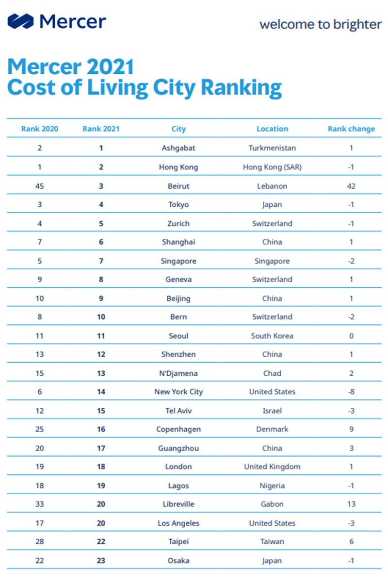 Siyahıda 2020-ci illə müqayisədə maraqlı dəyişikliklər var. Ötən il 45-ci olan Livanın paytaxtı Beyrut bu il kifayət qədər yüksələrək, 3-cü ən bahalı şəhər adını qazanıb. Səbəb ölkədəki iqtisadi tənəzzül, pandemiya və siyasi risklərdir. Avstraliya və Avropa şəhərləri də yuxarıya doğru ən çox yerini dəyişib. Nyu-York 10 ən bahalı şəhər siyahısından çıxıb, ötən il 21-ci olan Moskva bu il 62-ci, 59-cu olan Sankt-Peterburq isə mövqeyini 60 pillə itirərək, 119-cu yerə düşüb.