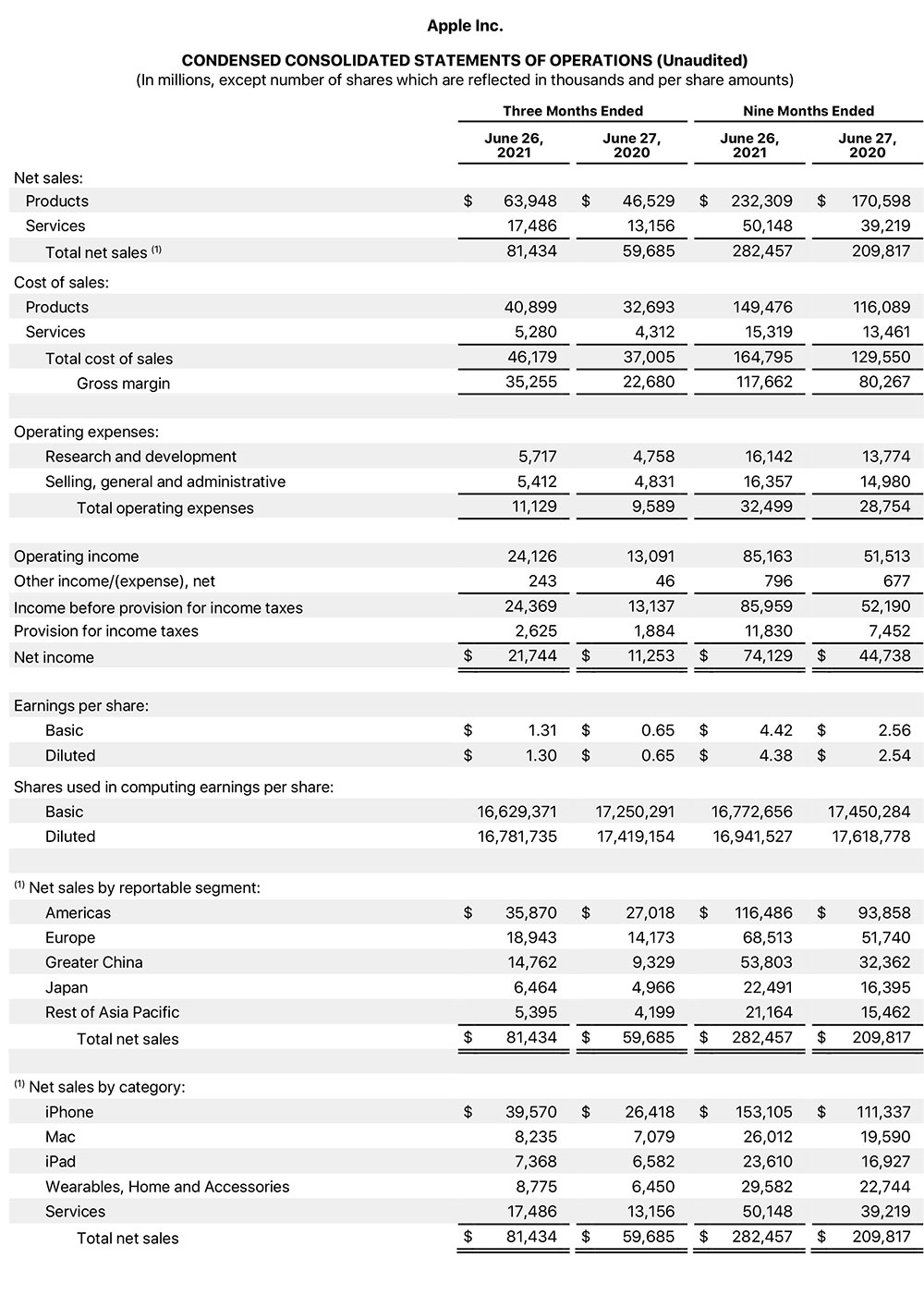 İyunda sona çatan 3 aylıq dövrdə (aprel-iyun) Apple şirkətinin cəmi gəlirləri (satış) illik 36% artaraq 81 milyard 434 min dollar təşkil edib (ötən ilin eyni dövründə 59 milyard 685 min dollar olmuşdu). Maliyyə ilinin 9 ayı ərzində isə cəmi satışlarının həcmi 282 milyard 457 min dollar təşkil edib.