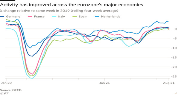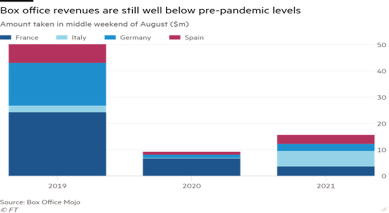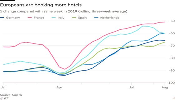 Bununla belə, bir sıra sahələr hələ də kifayət qədər geridədir. Avropada uçuşlar 2020-ci ilin əvvəlindən ən yüksək səviyyəyə çatsa da, 2019-cu ilin göstəricilərindən 30% aşağıdır. Həmçinin, Avrozonanın 4 ən iri iqtisadiyyatında avqustun ortasında kinoteatrların həftəsonu gəlirləri 16 milyon dollara çatıb. Bu isə 2019-cu ilin yay mövsümündəki 50 milyon dollardan xeyli azdır.