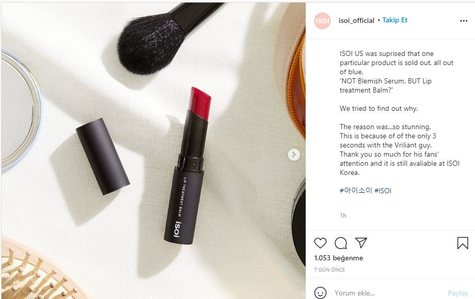 Pop qrupu BTS-in üzvü, Cənubi Koreyanın pop musiqiçisi Taehyung-un, ISOI adlı bir Koreya kosmetika markasının məhsulunu dodağına sürtdüyü videonun sosial mediada yayılmasının ardından şirkətin anbarlarında həmin məhsul qısa müddət ərizndə tükənib.