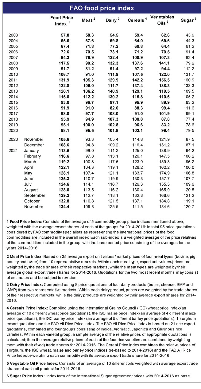 Marja xəbər verir ki, Birləşmiş Millətlər Təşkilatının Ərzaq və Kənd Təəsrrüfatə Təşkilatı (FAO) tərəfindən hazırlanana taxıllar, süd məhsulları, bitki yağları, ət və şəkər qiymətlərindəki aylıq dəyişiklikləri izləyən dünya qida qiymətləri indeksi Oktyabr ayının revizə edilmiş 132.8 səviyyəsindən Noyabr ayında 134.4-ə yükəlib.