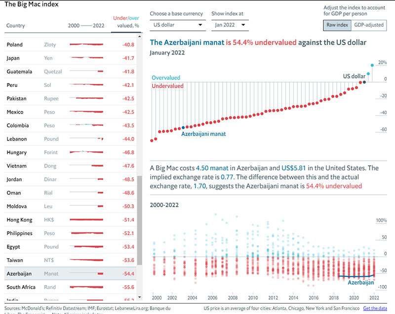 "Big Mac" indeksinə görə, manat dollar qarşısında ucuz qiumətləndirilib. İndeksdən belə çıxır ki, 1 manat 1,30 dollara bərabər olmalıdır. Bu gün isə 1 manat 0,59 dollar bərabərdir.