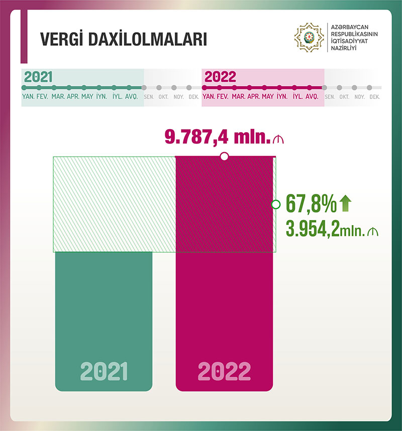 Dövlət büdcəsinə vergi daxilolmalarında növbəti dəfə yüksək göstəricilər əldə olunub və 2022-ci il yanvar-avqust aylarında dövlət büdcəsi-nə 9 milyard 787,4 milyon manat vəsait köçürülüb.