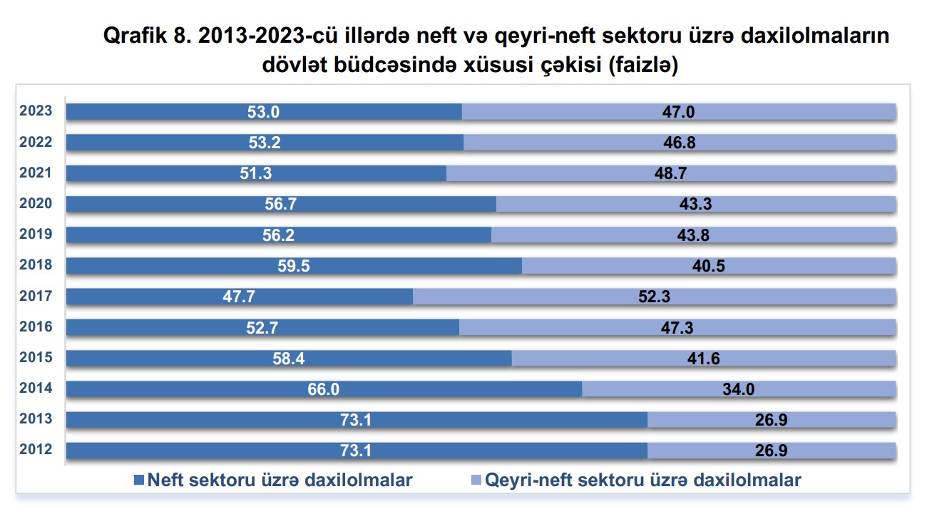 Gələn ilin dövlət büdcəsinin 47%-i isə qeyri-neft sektoru üzrə daxilolmalar hesabına yaranacaqdır.