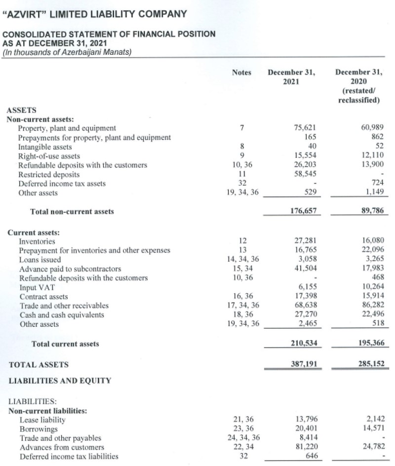 31 dekabr 2021-ci il tarixində "AzVirt" 387 milyon 191 min manat cəmi aktivlərə malik olub. Şirkət 2020-ci ilin sonunda 285 milyon 152 min manat cəmi aktivlərə malik idi.