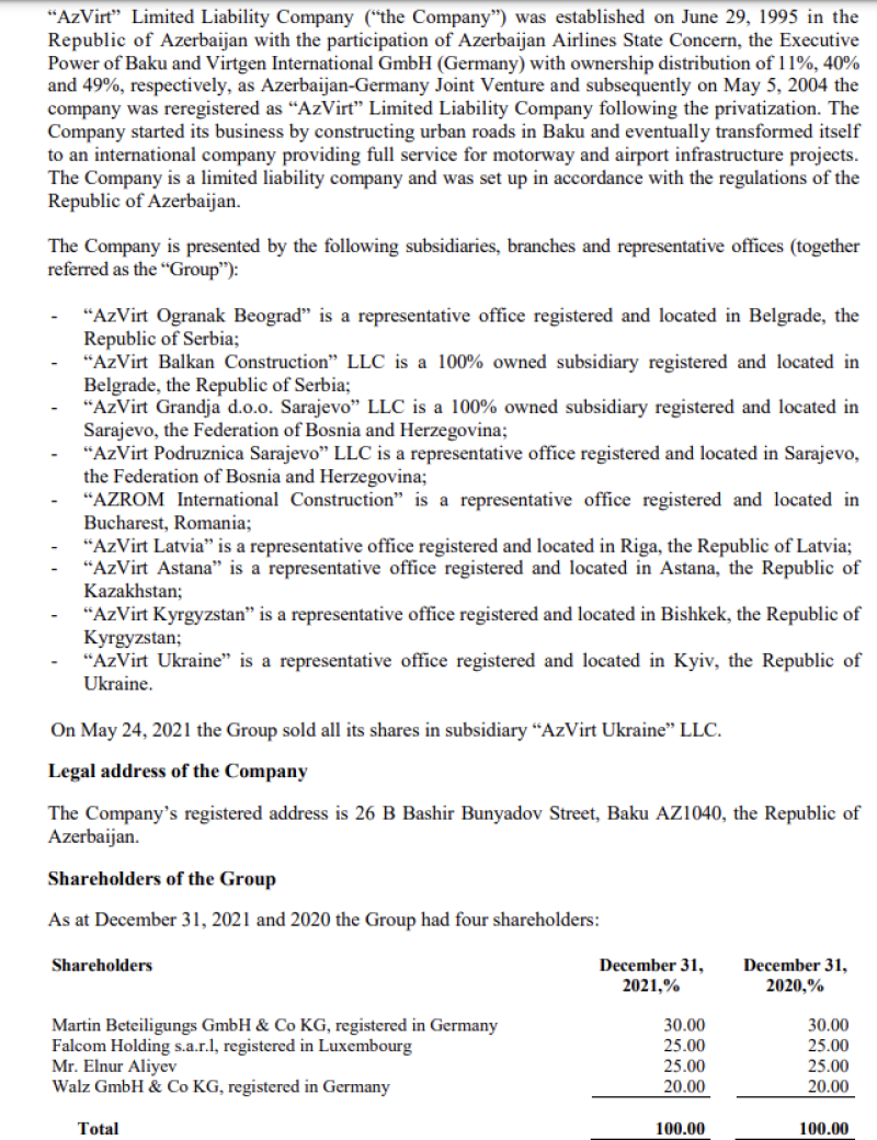 Azərbaycanın ən böyük və tanınmış yol tikinti şirkətlərindən biri olan "AzVirt" 2021-ci ili 6 milyon 527 min manat xalis mənfəət ilə başa vurub."AzVirt" şirkətinin xalis mənfəəti 2020-ci illə müqayisədə 2021-ci ildə 2,1 dəfə artıb. Şirkət 2020-ci ili 3 milyon 63 min manat xalis mənfəət ilə bağlamışdı.