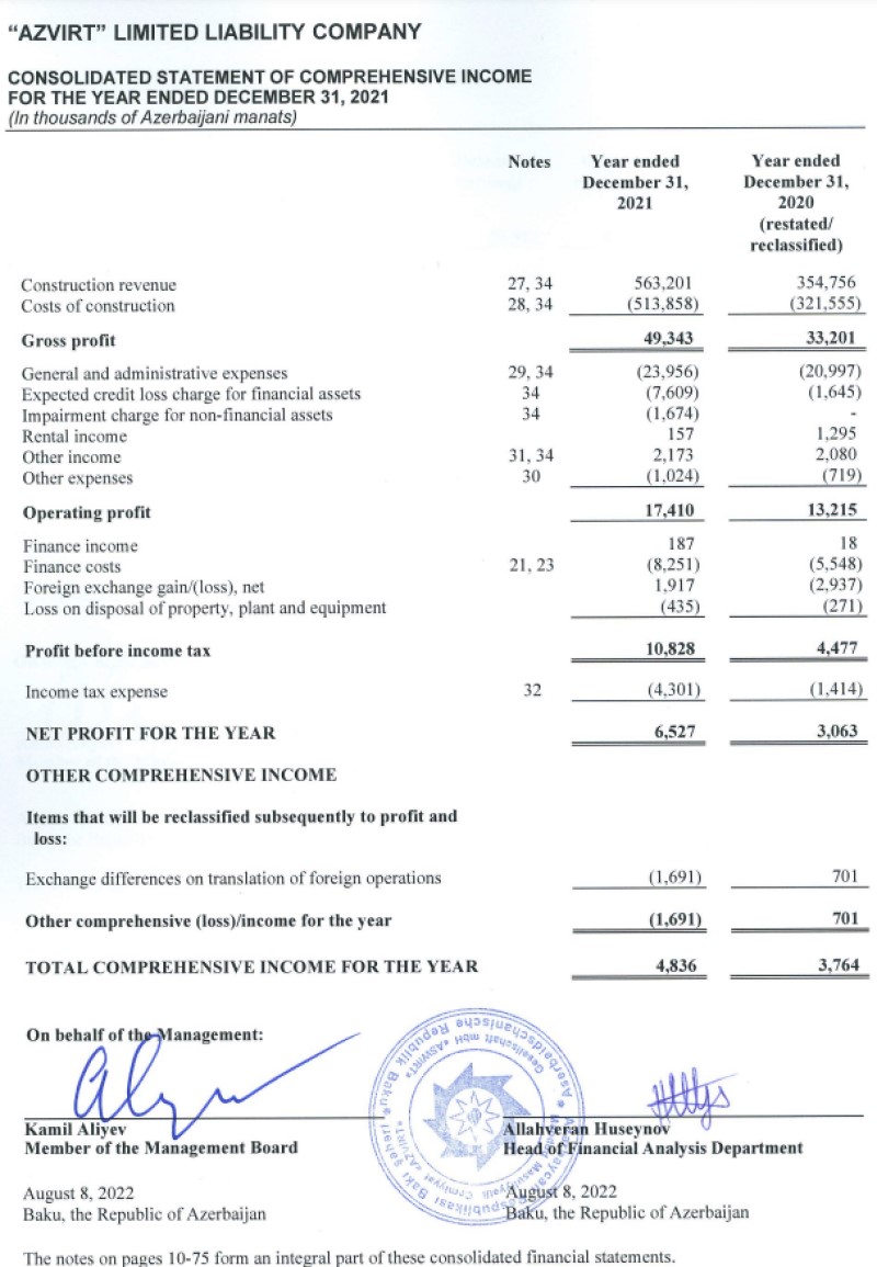 Marja.az xəbər verir ki, 2020-ci ildə "AzVirt"in əsas əməliyyat gəlirləri (inşaat işlərindən gəlirləri) 354 milyon 756 min manat ikən, 2021-ci ildə 563 milyon 201 min manata yüksəlib (208 milyon 445 min manat və ya 58,7% artıb).