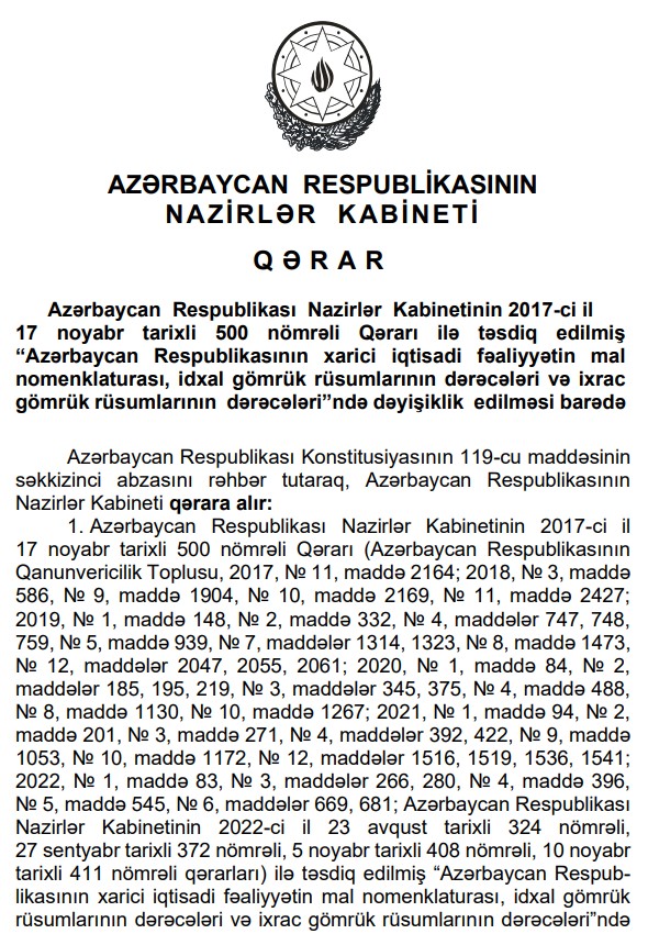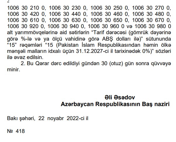Nazirlər Kabinetinin Qərarına əsasən Pakistan İslam Respublikasından idxal edilən həmin ölkə mənşəli düyünün 31.12.2027-ci il tarixinədək idxal gömrük rüsumundan azad edildi.