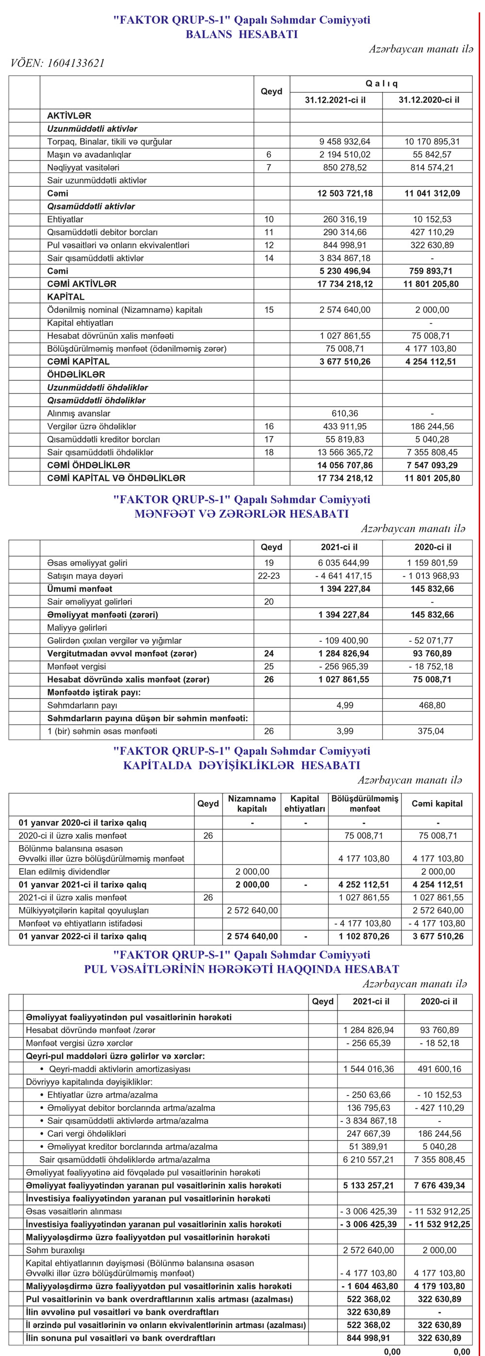 "Faktor Qrup-S-1" QSC 2021-ci ili 1 milyon 28 min manat xalis mənfəət ilə başa vurub. Şirkət 2020-ci ili 75 min manat xalis mənfəət ilə bağlamışdı. Beləliklə, "Faktor Qrup-S-1" QSC-nin xalis mənfəəti 2020-ci illə müqayisədə 2021-ci ildə təxminən 14 dəfə artıb.