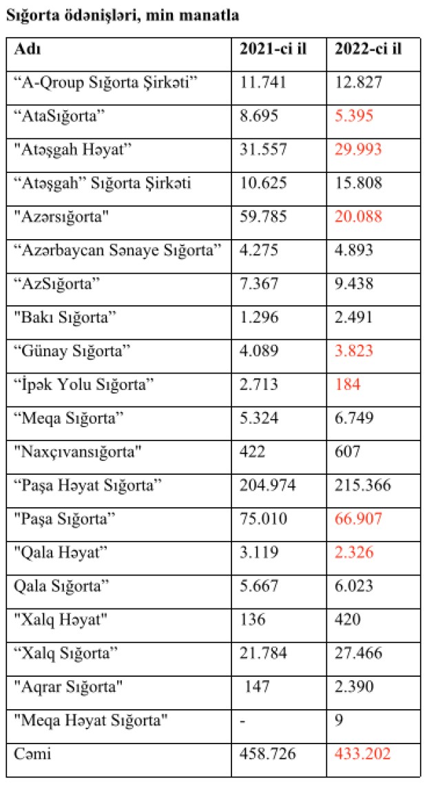 Həmçinin ötən il 7 şirkətin sığorta ödənişləri azalıb, 13-nünü isə artıb. “AtaSığorta”, “Atəşgah Həyat”, "Azərsığorta", "Günay Sığorta”, “İpək Yolu Sığorta”, “Paşa Sığorta” və "Qala Həyat” şirkətləri daha az sığorta ödənişləri həyata keçiriblər.