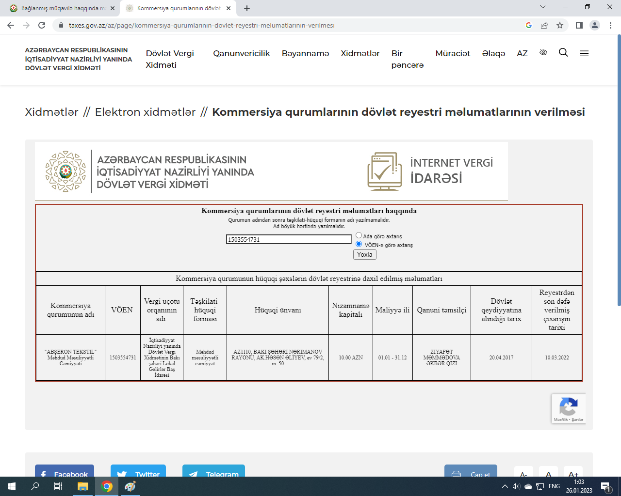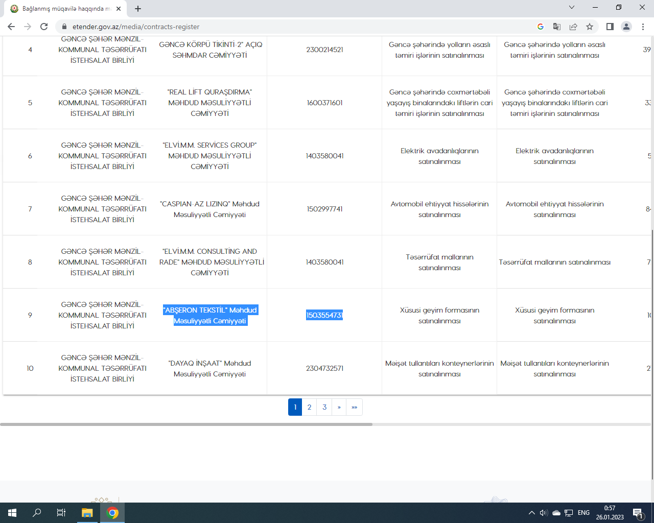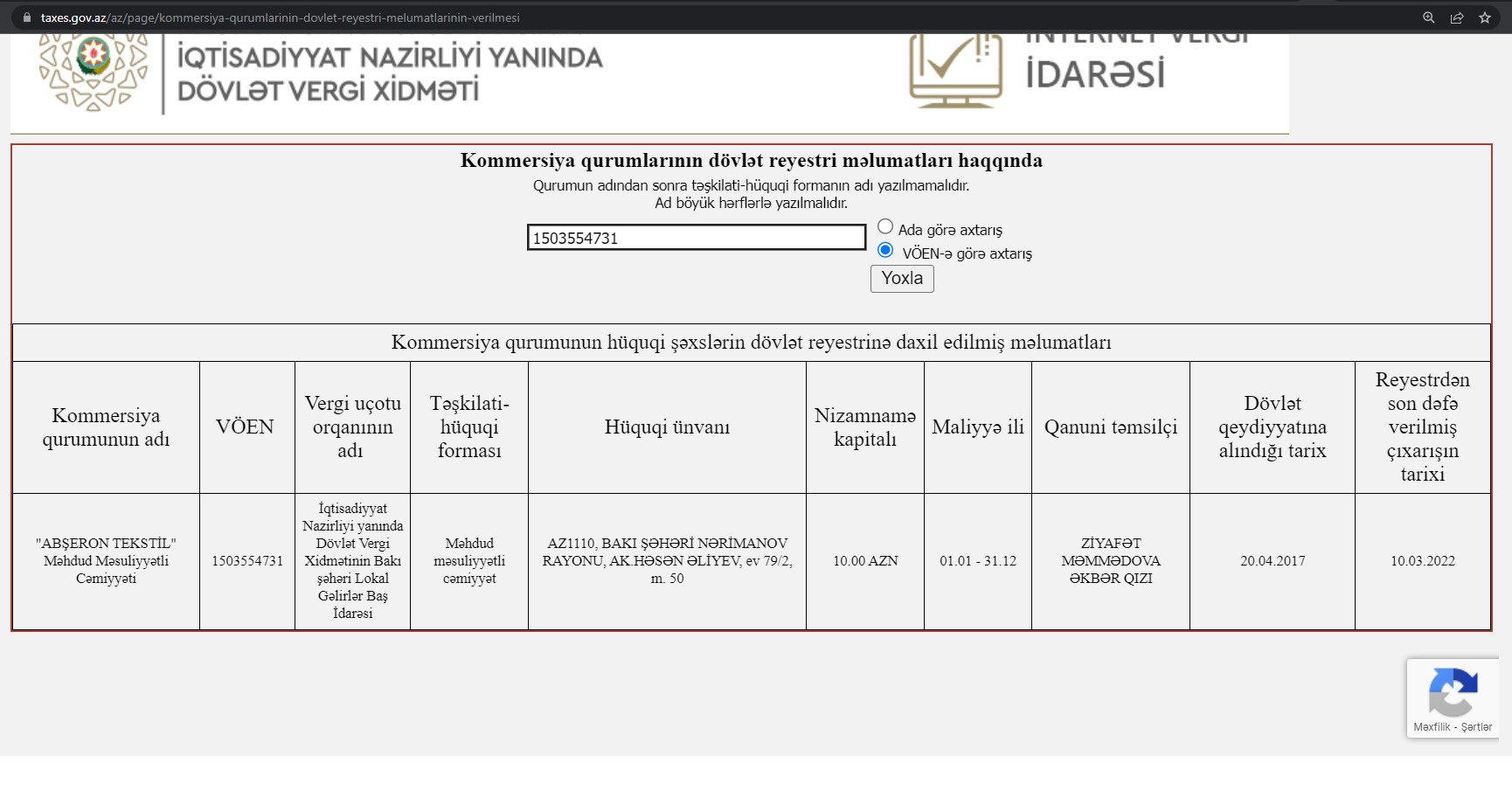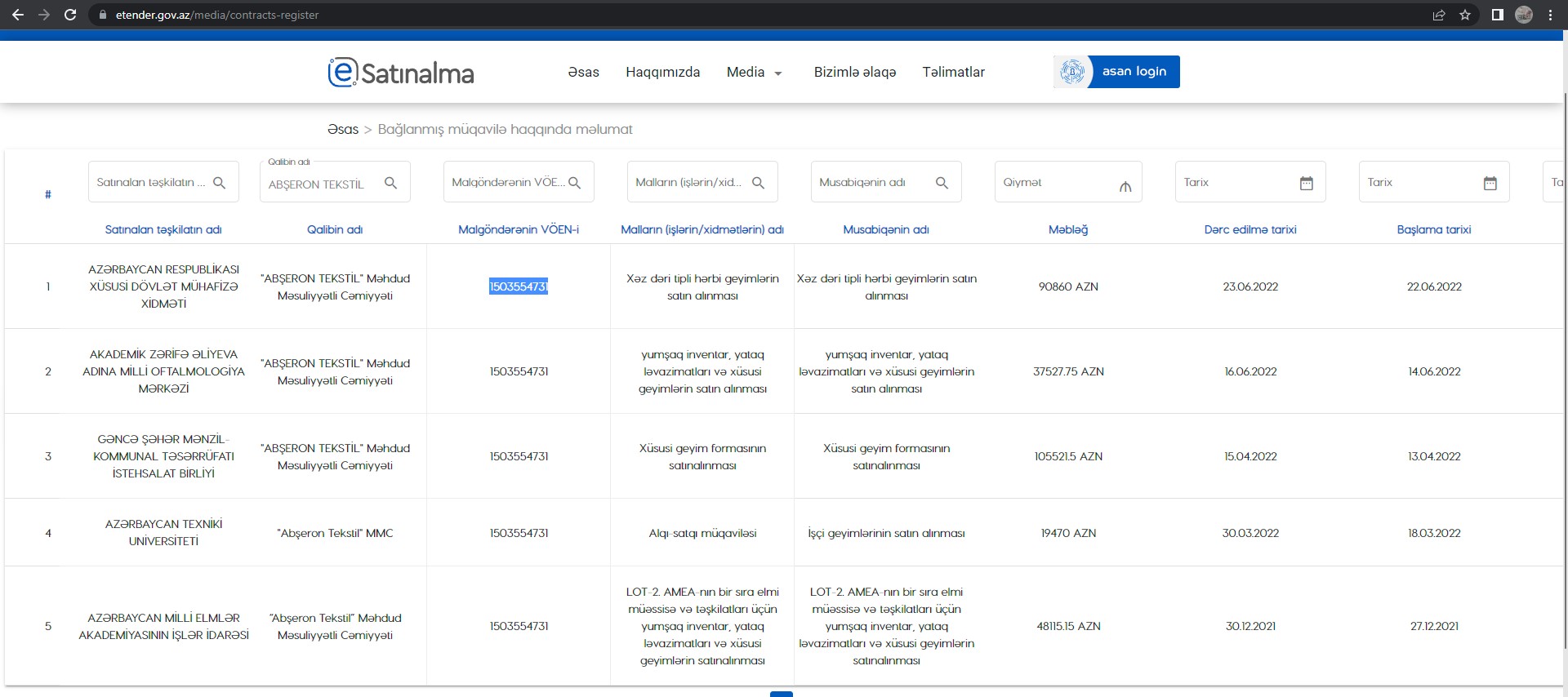 Sual doğuran məqamlardan biri odur ki, hər iki şirkətin VÖEN-i eynidir – 1503554731. Azərbaycan Respublikası İqtisadiyyat Nazirliyi yanında Dövlət Vergi Xidmətinin Kommersiya qurumlarının dövlət reyestri məlumatlarında 1503554731 VÖEN üzrə axtarış etdikdə “Abşeron Tekstil” MMC-nin məlumatları çıxır, halbuki, tender sənədlərində həmin VÖEN hər iki şirkət üçün eynidir.