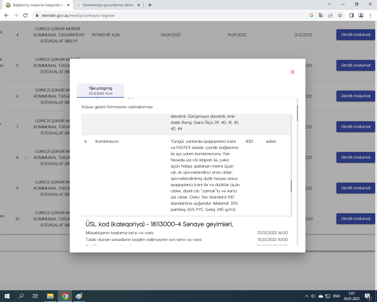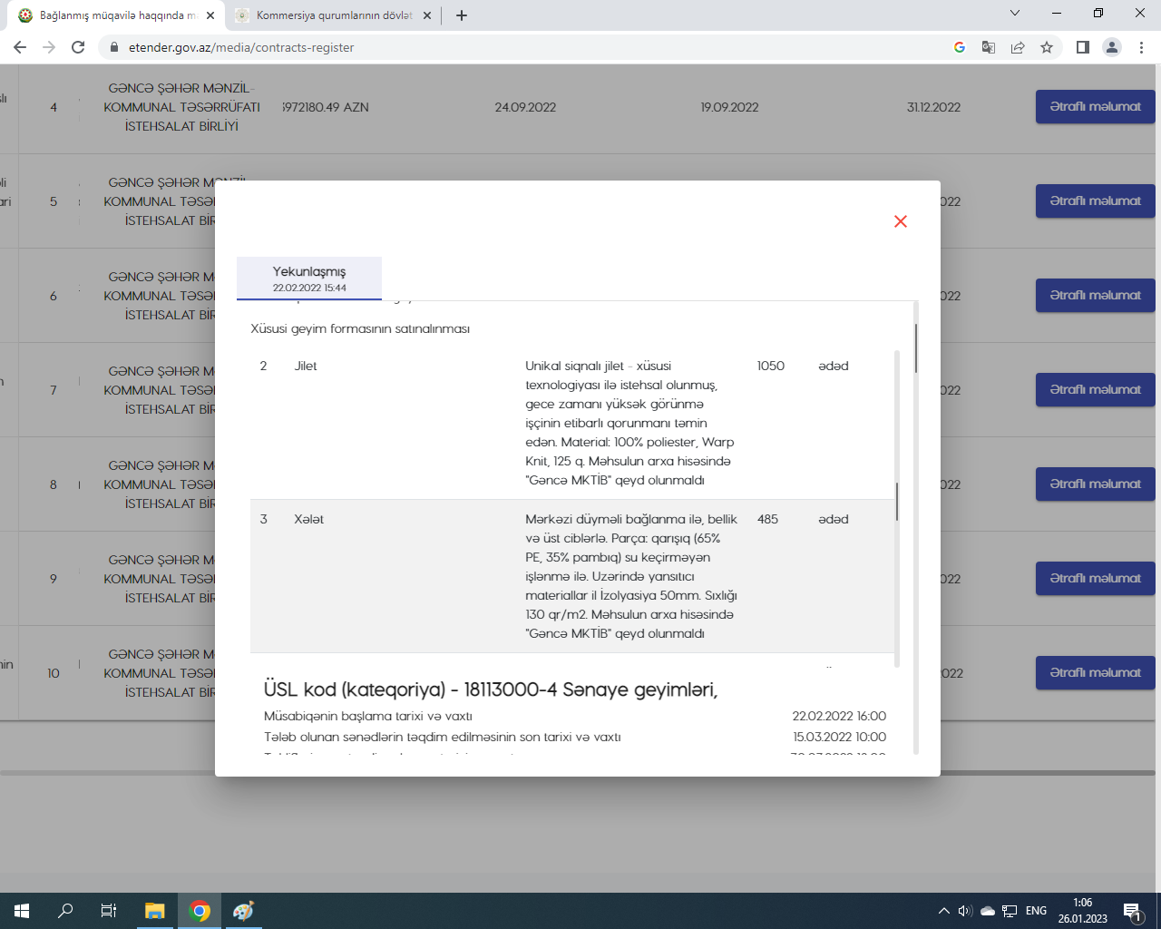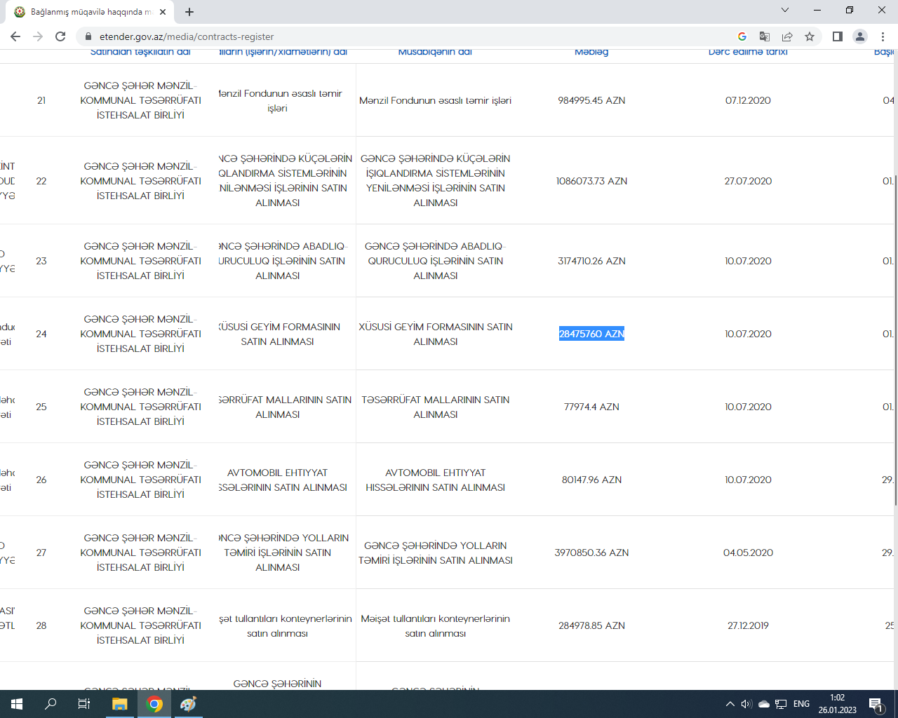 Tender məlumatlarına baxdıqda məlum olur ki, işçilərin xüsusi geyimlərlə təminatı ilə bağlı Gəncə MKTİB 2020-ci ildən bu günə qədər 3 dəfə - 31.12.2020, 31.03.2022, 31.12.2022 tarixlərində - tender keçirdib. İki tenderdə “LK Machinery” MMC, bir tenderdə isə “Abşeron Tekstil” MMC qalib olublar.