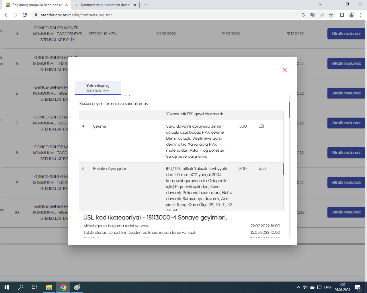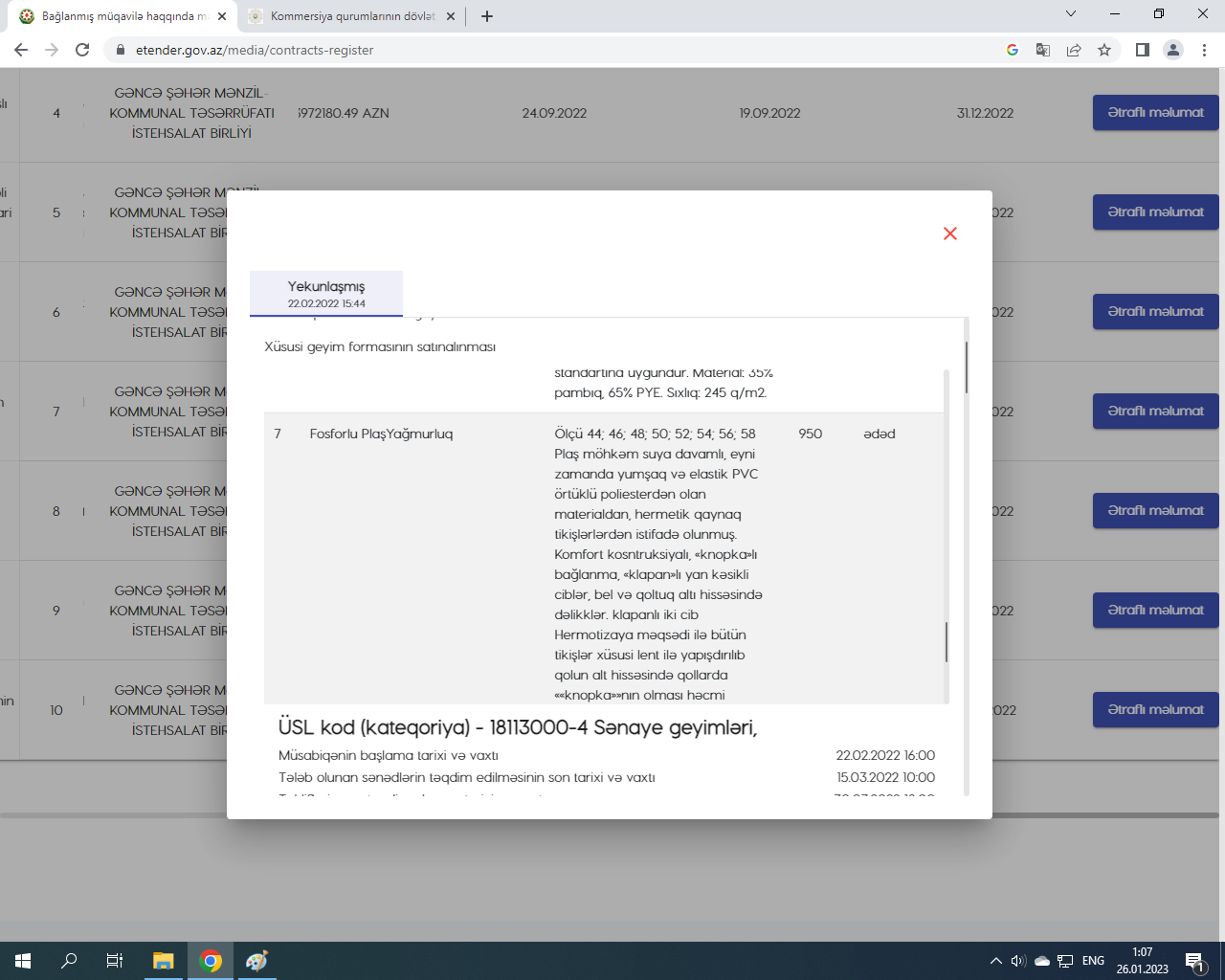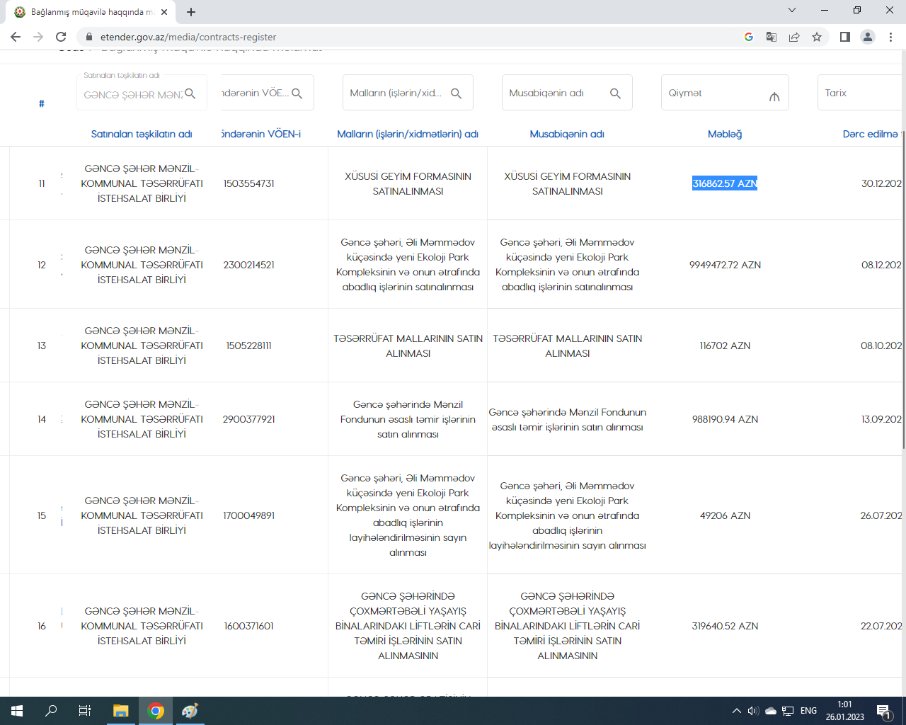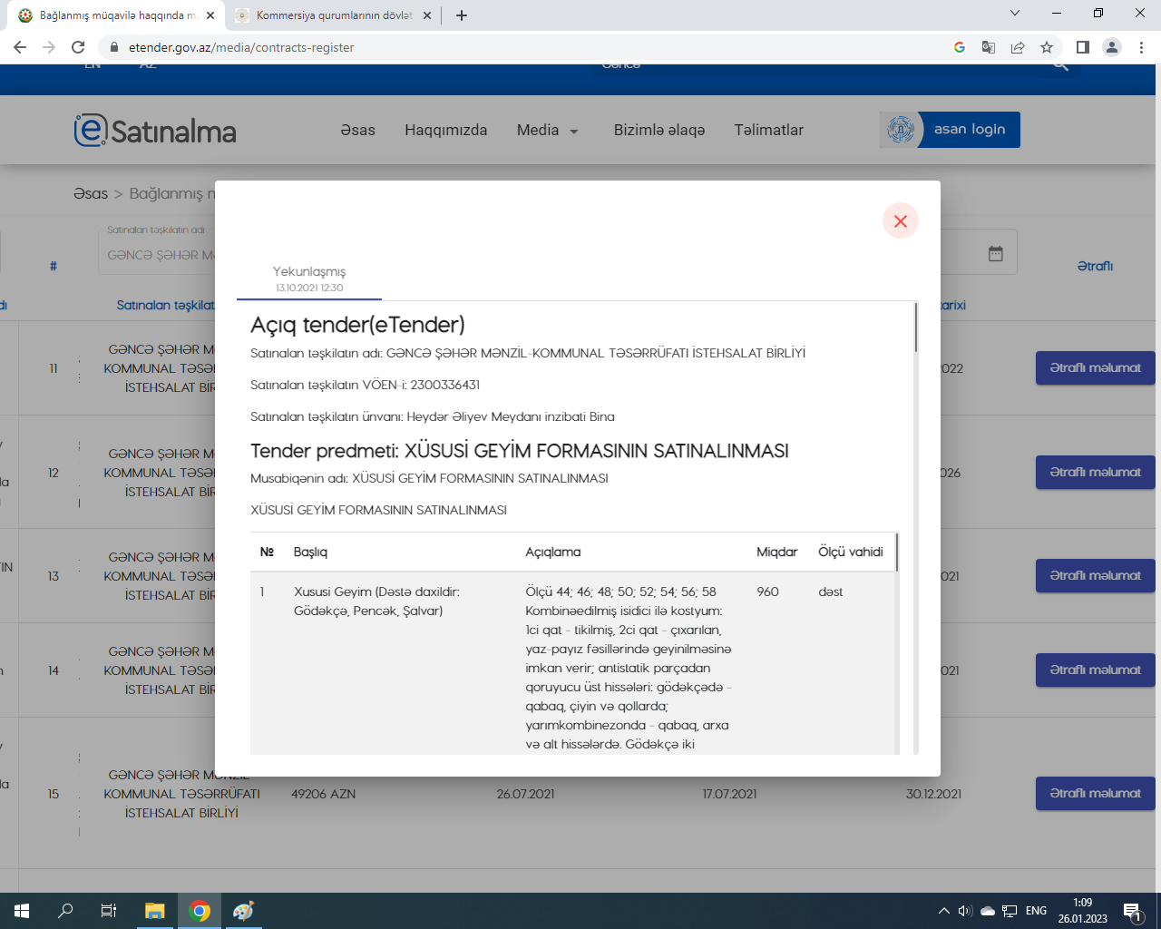 Tender məlumatlarına baxdıqda məlum olur ki, işçilərin xüsusi geyimlərlə təminatı ilə bağlı Gəncə MKTİB 2020-ci ildən bu günə qədər 3 dəfə - 31.12.2020, 31.03.2022, 31.12.2022 tarixlərində - tender keçirdib. İki tenderdə “LK Machinery” MMC, bir tenderdə isə “Abşeron Tekstil” MMC qalib olublar.