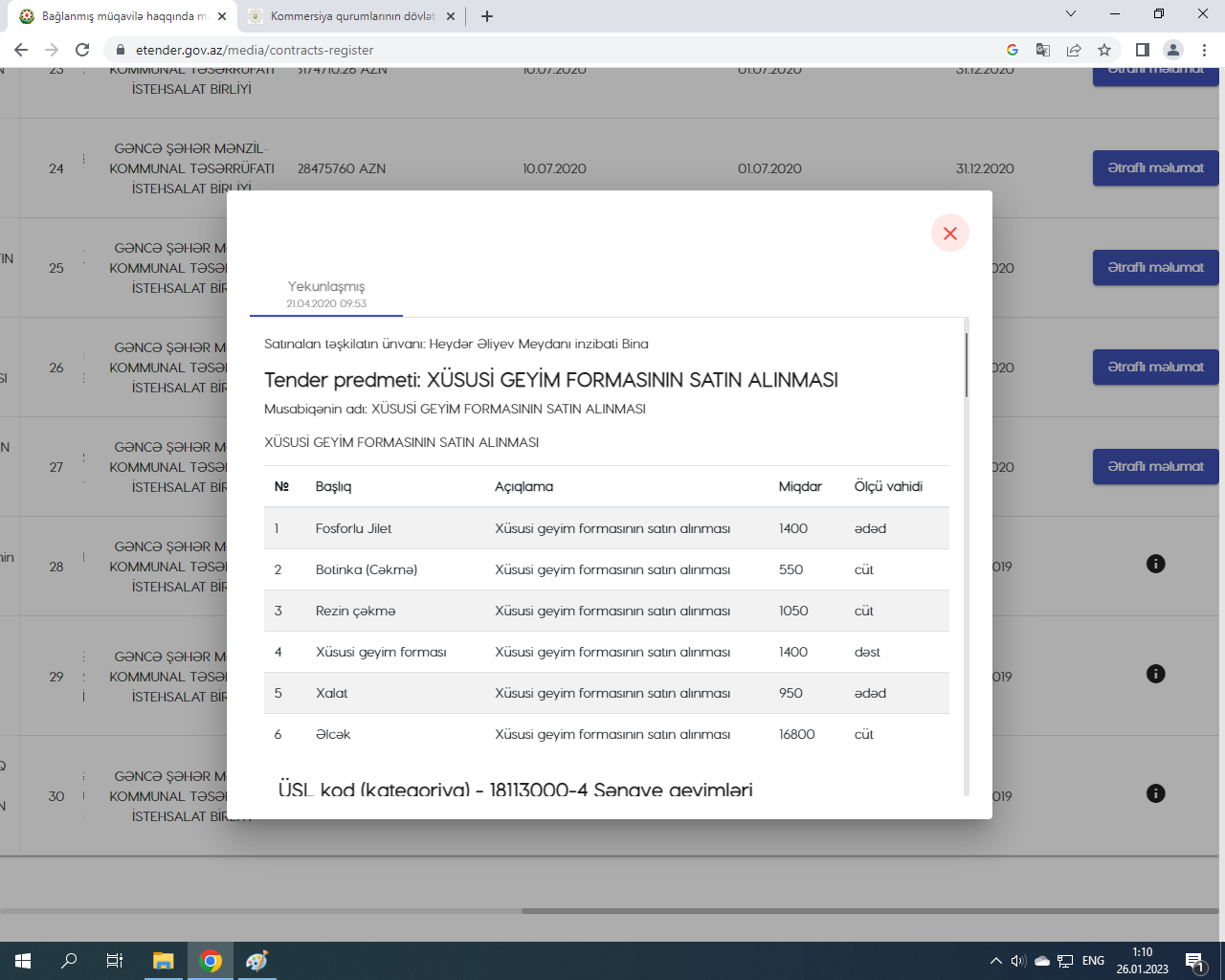 Tenderlər üzrə alınmış xüsusi geyimlərin miqdarı belədir: