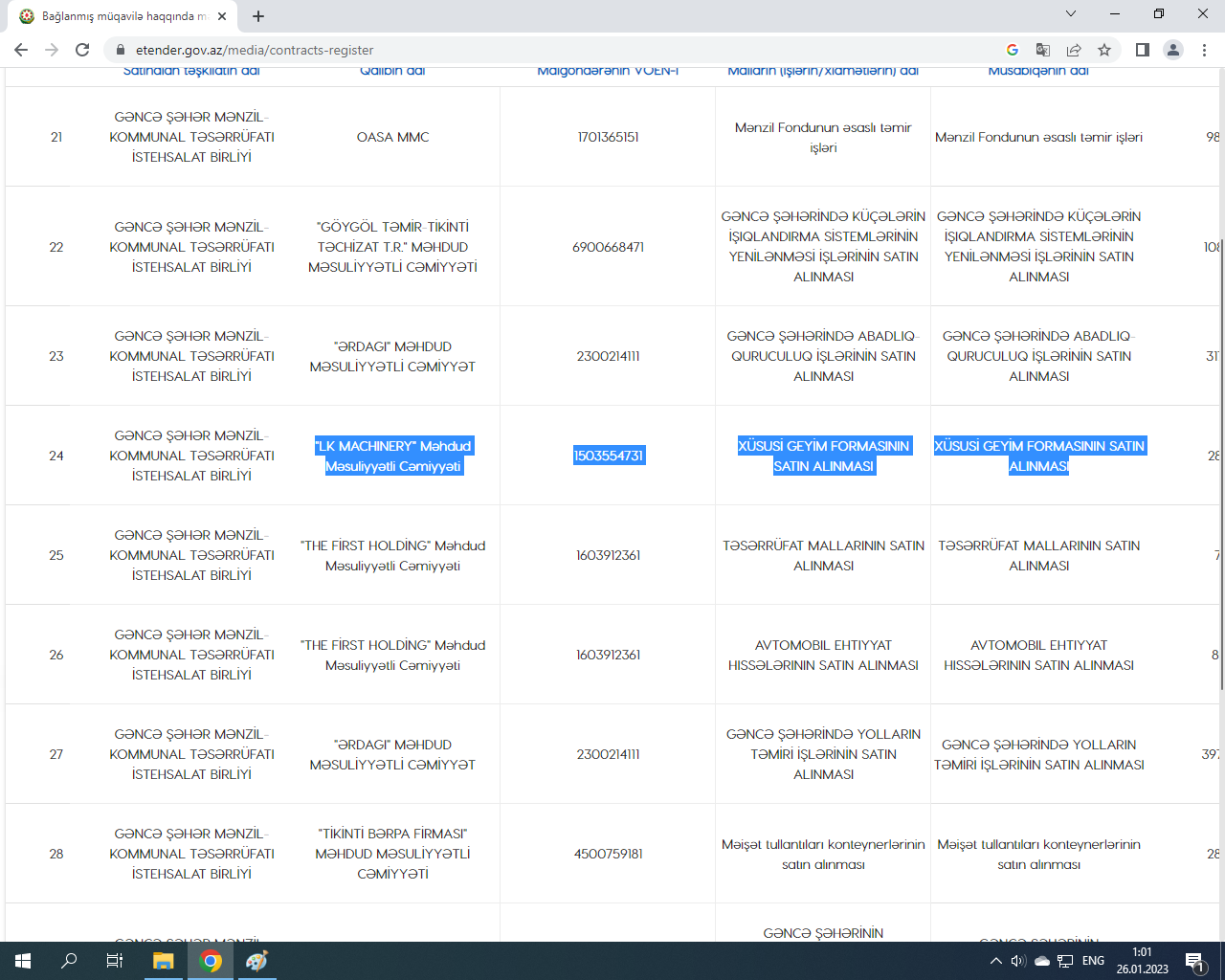 Marja.az-ın araşdırmasına görə, 10.03.2022-ci il tarixində 1503554731-ü üzrə reyestrdən çıxarış verilib. Bu çıxarış 2022-ci ilin əvvəlində "LK Machinery" şirkətinin adının "Abşeron Tekstil"ə dəyişdirilməsi ilə əlaqədar ola bilər. Ad dəyişikliyi zamanı VÖEN dəyişmir, bu səbəbdən tenderlərdə eyni VÖEN-li iki fərqli adda şirkətin görünməsi mümkündür. 10.03.2022-ci il tarixindən sonra tenderdə qalib gələn "Abşeron Tekstil" şirkəti "LK Machinery" şirkətinin varisidir.