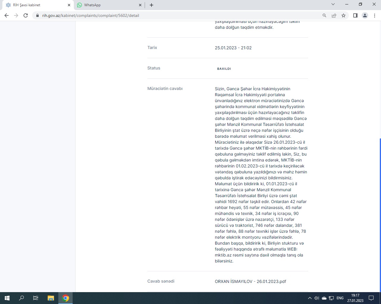 "Mən vətəndaş olaraq “Facebook” sosial şəbəkəsində Gəncə şəhər Mənzil Kommunal Təsərrüfat İstehsalat Birliyinin (Gəncə MKTİB) “facebook” səhifəsinə yazaraq Gəncədə MKTİB-in küçə təmizliyi ilə məşğul olan işçilərinin isti qış geyimləri ilə hansı səbəbdən təmin olunmadıqları, soyuqda həmin işçilərin necə gəldi geyindiklərini irad tutdum. Bu iradıma cavab olaraq Gəncə MKTİB tərəfindən mən barəmdə hüquq-mühafizə orqanlarının ölçü götürəcəyi ilə bağlı hədələndim və səhifəyə girişim bloklandı. Mən Gəncə MKTİB tərəfindən işçilərinin geyim təminatı ilə bağlı müstəqil araşdırma apardım və www.etender.gov.az portalı üzərindən sorğu verərək Gəncə MKTİB-in keçirdiyi tenderlərə baxdım. Maraqlı məlumatlar əldə etdim və onları ölkə ictimaiyyətinə sizin sayt vasitəsi ilə təqdim edirəm.