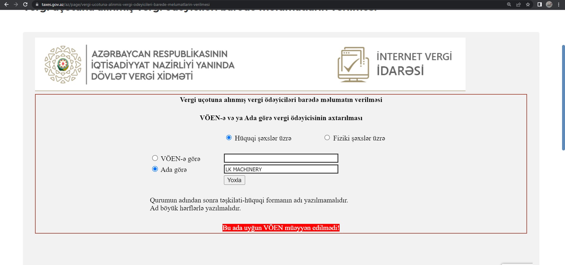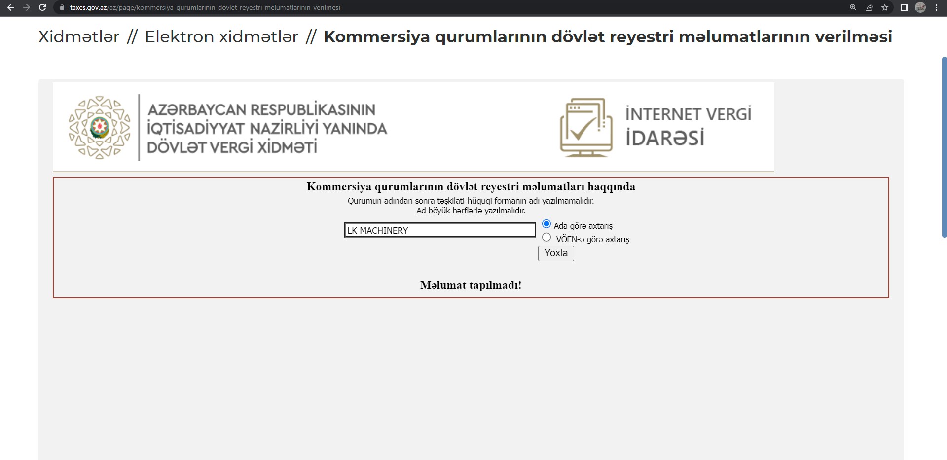 Qeyd edək ki, Kommersiya qurumlarının dövlət reyestri məlumatlarına “LK Machinery” adı ilə sorğu etdikdə "Bu ada uyğun VÖEN müəyyən edilmədi", "Məlumat tapılmadı!" cavabları verilir. 1503554731 VÖEN-i ilə sorğu etdikdə isə “Abşeron Tekstil” MMC haqqında bəzi məlumatlar göstərilir.